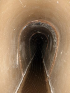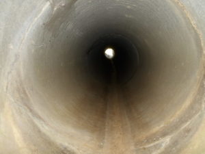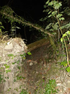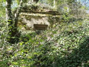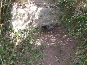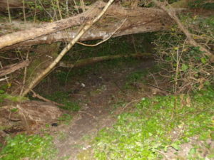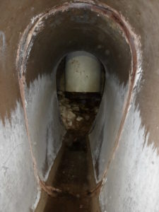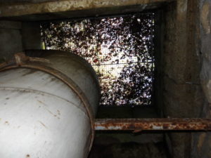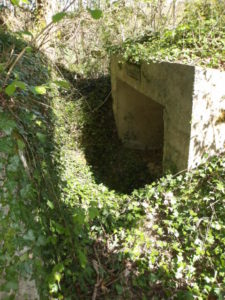 Sinon, ça se passe à croupetons, hauteur maximale 0,8 m, largeur maximale 0,6 m, mais avec les pieds l’un derrière l’autre et non pas côte à côte, c’est très fatigant surtout si on est « grand ou grande ». Ensuite, remonter un puits carré large et profond de 4,5 m encombré par une grosse canalisation cylindrique, et fermé dans le haut par une grille, escamotable ou non. Evidemment, sans échelons ! De plus les accès aux deux bouts sont encombrés de végétation piquante !