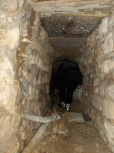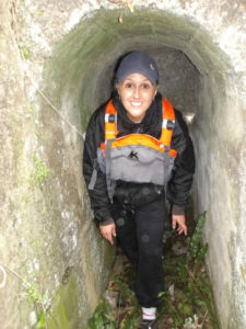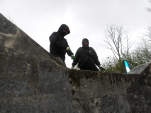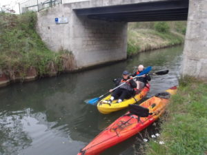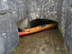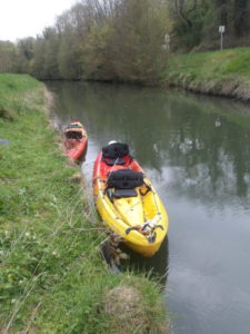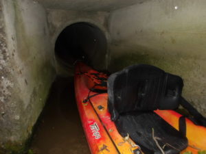 Manoeuvres de descente des kayaks dans le déversoir à ciel ouvert, en jouant à cache-cache avec les voitures circulantes…heureusement peu nombreuses. Dissimulation des embarcations dans le boyau de décharge pour l’une, et dans le tunnel sous-routier pour l’autre !
