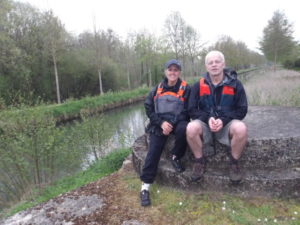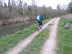 Remise en place et réglages des selles…et départ VTT pour 18 km sur chemin de halage. Il ne pleut pas mais une sorte de petite bruine en suspension en donne l’impression. Peu ou pas de vent, heureusement !