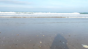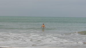 Mais sur cette longue plage, en dépit de ces mises en garde, il y a enfin un peu de monde (Bien que cela reste très relatif !) dont de rares baigneurs « nus », et quelques surfeurs. « Nus », c’est à dire sans combinaison en néoprène !