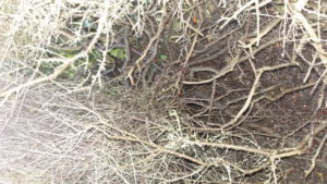 Pour découvrir après 10 mètres que ce passage n’est peut-être pas vraiment « humain », et va nécessiter de combattre cette végétation si particulière des pentes littorales, riche en éléments épineux ! J’analyse, je réduis, j’accepte et me lance…Je suis rapidement pris en tenaille, et avec mon tee-shirt, je dois m’incliner et passer en mode « animal », c’est à dire ramper ou progresser à quatre pattes car la base des buissons est bien moins touffue et n’a plus d’épines.