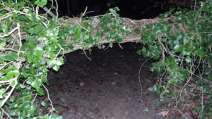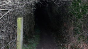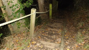 Enfin je trouve le sentier qui est plutôt glissant, monte et descend, patine ou avec des racines piégeuses, barré d’arbres tombés en travers, et dénivelle près de 150 m sur 2 km, sur le flanc droit du Gouessant avant de le traverser…et de nuit, la progression est un peu ralentie !