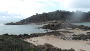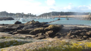 Le contournement du Castel bien rocheux, avec un petit air montagnard ramène à la plage de Tresmeur où il sera très agréable de marcher jusqu’à l’isthme de la Pointe de Bihit PK 09,90…Déjeuner au sommet, avec un petit vent frais ! PK 10,40.