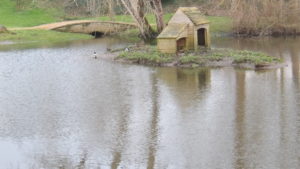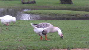J’ai presque deux heures de marge, mais la pluie se rappelle à moi, et je trouve refuge dans un petit abri du parc Sainte Anne, totalement désert pour cette occasion pluvieuse, sauf…les oies, dont une grande cygnoïde, canards et pigeons qui accourent vers moi dès que je m’assieds au banc de bois ! De bons réflexes conditionnés chez ces animaux habitués aux pique-niques humains, générateurs de « restes » alimentaires.